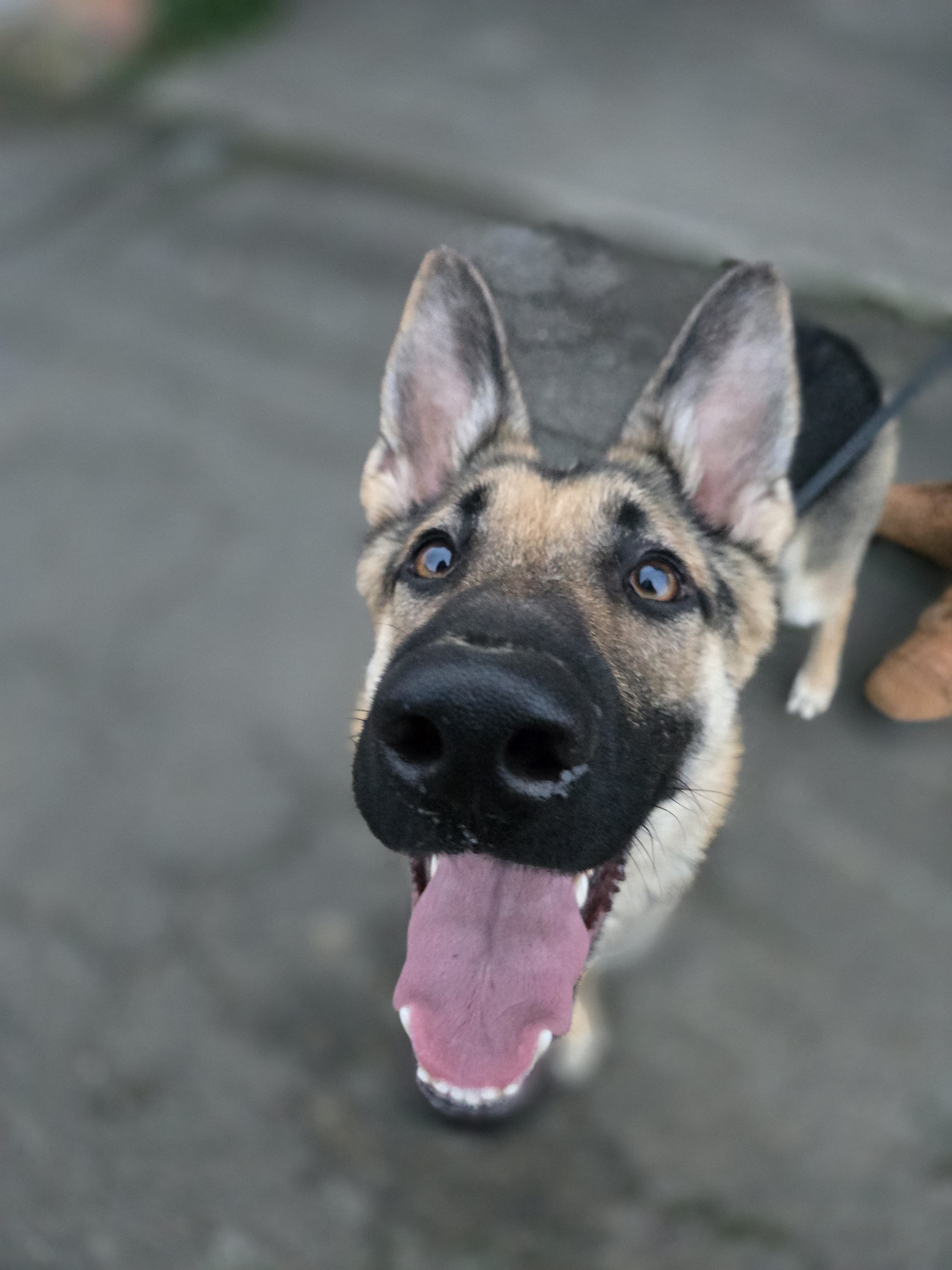 She has walked happily with a Cocker Spaniel and a Labrador, and she has been around children without ever showing aggression.