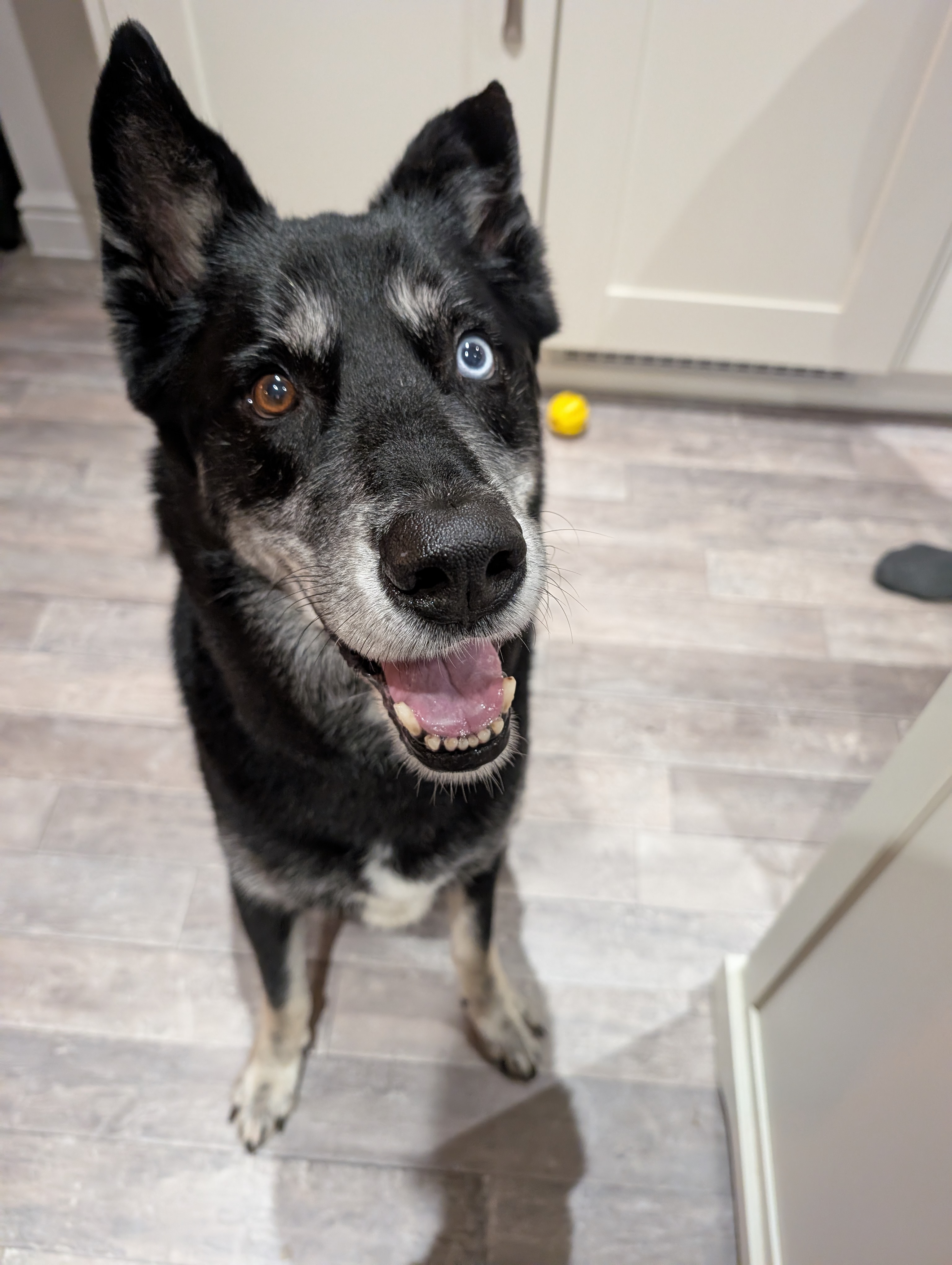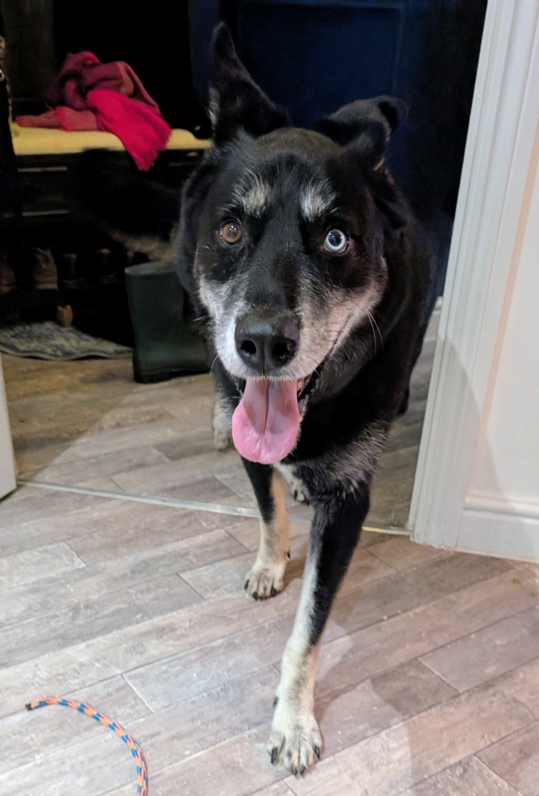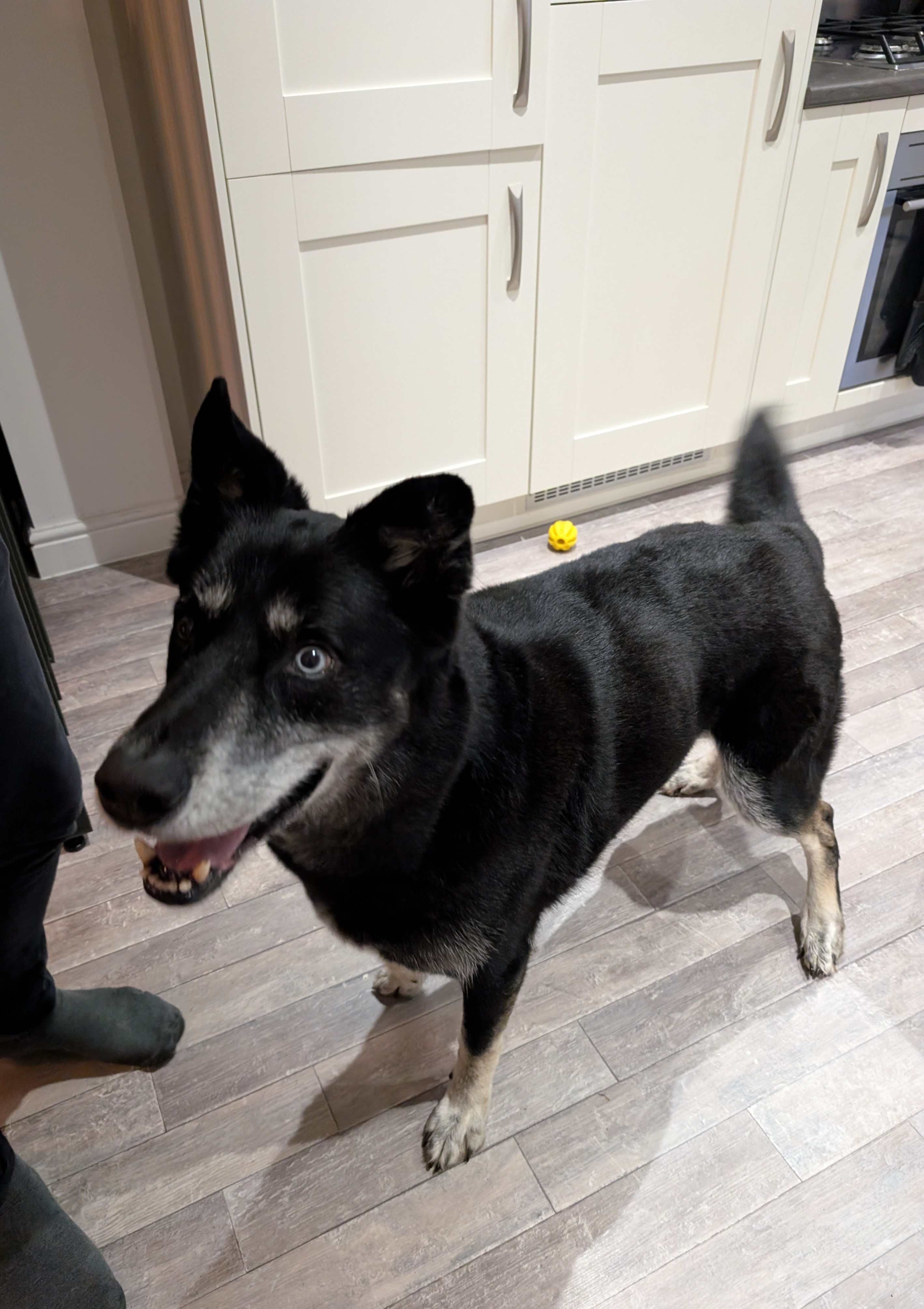 Storm is a very healthy looking boy in excellent condition with a silky shiny coat. When I arrived Storm was barking but he eventually calmed down and came to say hello calmly. He bought a toy and took treats very gently. He loves to play with his toys especially a game of tug. He seems an intelligent lad who would thrive with more interaction mental and physical. He is fit and full of purpose for his age.